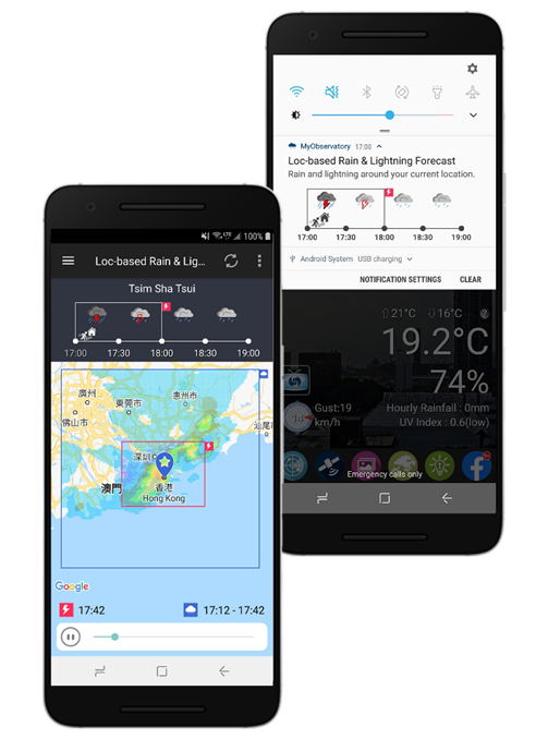 The Observatory launched an update of the “MyObservatory” app (iOS version 6.1, Android version 4.17) on 15 February 2020. In the new version, “Earth Weather” was enhanced with automatic sea state forecasts. On the new Android version, the “Location-based Rain Forecast” page is upgraded to “Location-based Rain and Lightning Forecast” to provide 1-hour lightning and 2-hour rain forecast. The notification function is also upgraded at the same time to provide lightning and rain forecast in a succinct graphical presentation.The "MyObservatory" is a free app. Users are welcome to download it at the following links (iOS, Android).