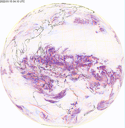 Figure 2. Animation of Time Difference images derived from Japanese Himawari-8 low level water vapour channel (6.25 µm) from 04:10 UTC 15 January to 23:50 UTC 17 January 2022 showing shock waves triggered from the volcanic eruption travelling around the globe.