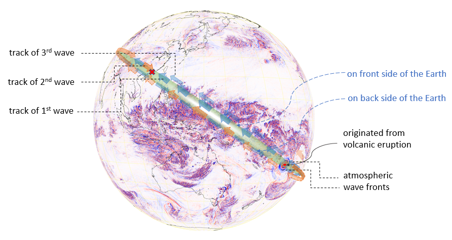 Queenie CC Lam and David TW HuiAs everyone knows, a gigantic submarine volcanic eruption occurred at Tonga in the South Pacific Ocean at around noon Hong Kong time (04 UTC) on 15 January 2022 (Global Volcanism Program, 2022). It was such an unusual event that it attracted the eyes of volcanologists, seismologists, oceanographers, meteorologists and climatologists alike. The submarine volcano, named Hunga-Tonga Hunga-Ha'apai (hereinafter as Tonga volcano), ejected a huge plume of ash soaring into the upper atmosphere and triggered a trans-basin tsunami that destroyed homes and caused several deaths on Tonga's nearby islands. The tsunami waves were recorded by buoy sensors and tide gauge stations on the coastal region of the Pacific Ocean and the South China Sea. People in places nearby Tonga heard a big explosion and smelt a strong odour of sulphur following the eruption. The eruption induced shock waves that circled the globe multiple times. The shock waves, which triggered pressure waves in the atmosphere and across the ocean surface, caused tsunami-like waves called meteotsunami in the Caribbean, Atlantic Ocean, Indian Ocean and the South China Sea.