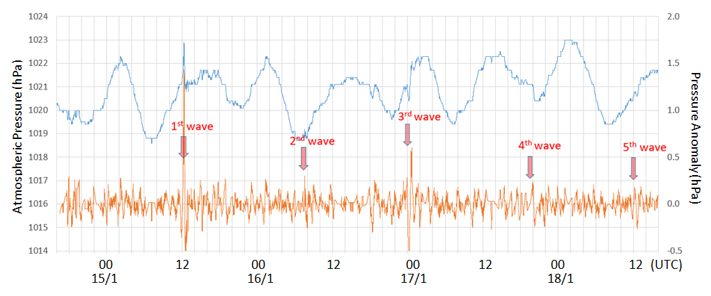 The shock waves in the air is pressure waves that were observed at many places around the world including Hong Kong. Figure 3 shows the wave fronts spreading out from the location of eruption and the travelling pathways of the pressure waves that hit Hong Kong, one in the Northwest direction (first wave to Hong Kong, thick blue arrows in Figure 3) and other one in the Southeast direction (second wave to Hong Kong from the other side of the earth, yellow arrows in Figure 3). The atmospheric pressure waves were propagating at a speed of about 310 m/s (taking around 8 hours to reach Hong Kong at a distance of about 9,000 kilometres). Up to around five pressure waves were discernible from pressure readings at Waglan Island (Figure 4). The 1st wave brought about a pressure change of around 2 hPa upon arrival, similar to the pressure change observation at Chichijima in Japan (Figure 5(a)). The 2nd wave arrived from the opposite direction carrying much less energy as evident from a smaller pressure change that it brought. The 3rd wave (thin blue arrows in Figure 3) and the 5th wave were in fact originated from the 1st but travelled round the globe once and twice respectively. Similarly, the 4th wave was originated from the 2nd wave that had travelled round the globe once before arrival.