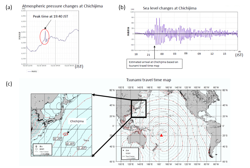 Figure 5. Observations of (a) atmospheric pressure change and (b) sea level change at Chichijima in Japan; (c) tsunami travel time map (Source: Japan Meteorological Agency; JST = UTC +9 h).
