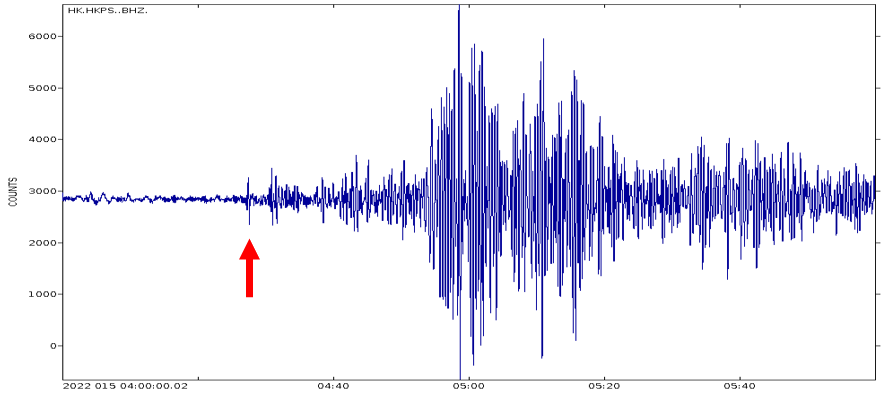 Figure 6. Seismic waveform indicating the arrival of P-wave (indicated by red arrow) detected by the broadband seismograph at Hong Kong Po Shan station at around 04:27 UTC on 15 January 2022.