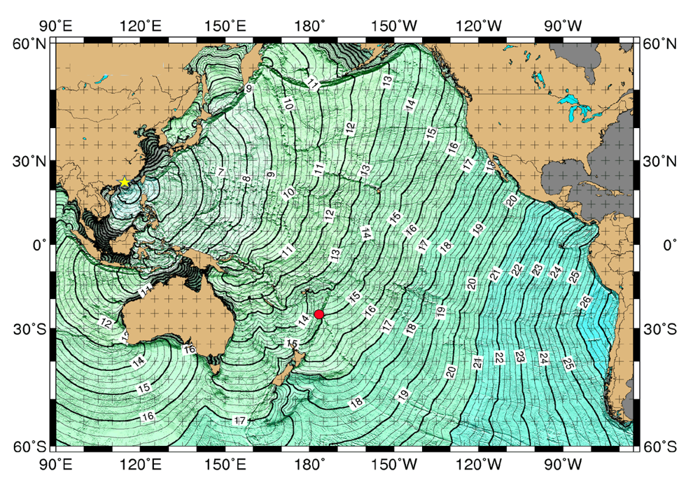 Figure 7. Tsunami Travel Time (TTT) chart marking the estimated time required for the tsunami waves reaching Hong Kong. The origin of seismic waves associated with the Tonga volcanic eruption as derived by USGS on 15 January 2022 is marked by the red dot and the location of Hong Kong is indicated by the yellow star.