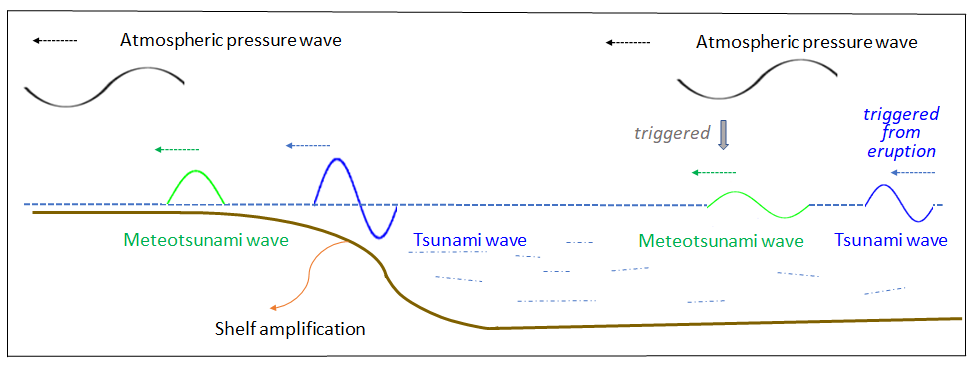Figure 8. A schematic diagram showing meteotsunami wave (in green) induced by fast moving atmospheric pressure wave and 'usual' tsunami wave (in blue) triggered from the eruption. Both the long waves associated with meteotsunami and tsunami were amplified due to the effect of the shelf.