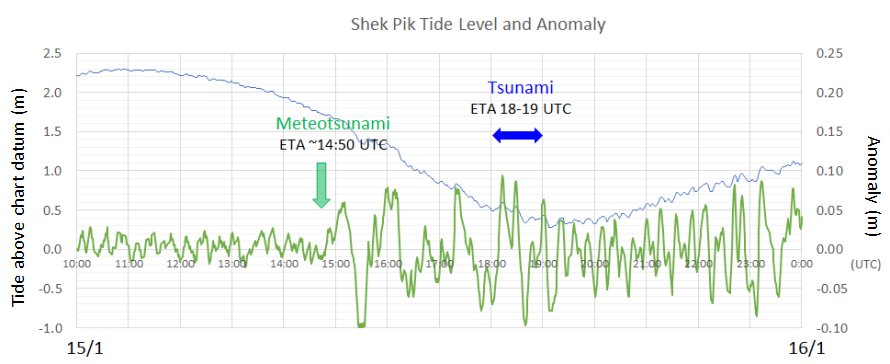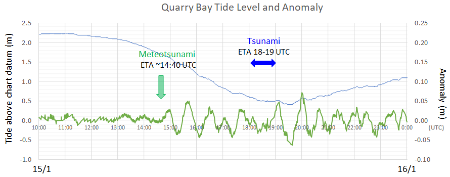 A schematic diagram in Figure 8 shows the fast moving atmospheric pressure wave triggering meteotusnami wave as well as amplification of long waves associated with meteotsunami and tsunami due to shoaling effect of the South China Sea continental shelf though there is energy dissipation through friction and turbulence. The meteotusnami waves reached Hong Kong around 3-4 hours before the estimated time of arrival of tsunami waves, and around 2.5 hours after the arrival of the first atmospheric pressure wave. The coupling of meteotsunami waves and tsunami waves makes it difficult to identify the arrival time of tsunami waves from time series analysis. The tsunami waves brought slight changes to the water levels in Hong Kong. The maximum amplitude of the tsunami waves was estimated to be about 7 cm at Quarry Bay and about 10 cm at Shek Pik (Figure 9).