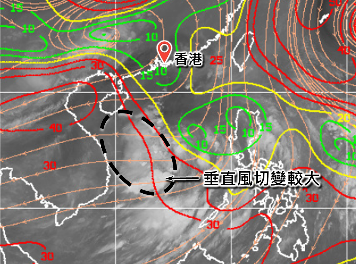 大气环境条件方面,当时南海西部的垂直风切变较大(图一),若果暹芭采取较偏西路径,垂直风切变或不利其进一步发展。因此,根据集成预报的原则和南海的大气环境条件,天文台在6月29日预测暹芭可能发展为热带风暴,与欧洲、日本和英国模式相若。