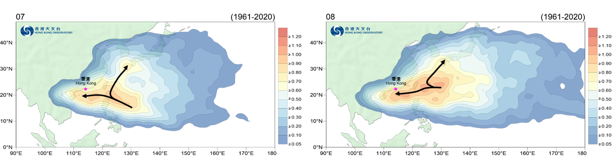 香港在夏季不时受到热带气旋影响,当中不少都在西北太平洋形成,自东向西经过吕宋海峡或菲律宾进入南海。在七、八月的盛夏季节,西北太平洋及南海的热带气旋通常会采取两类主要路径(图一):一类是以西或西北路径移向华南或横过南海;而另一类在是在台湾以东一带转向中纬度地区,不会直接影响华南或南海。