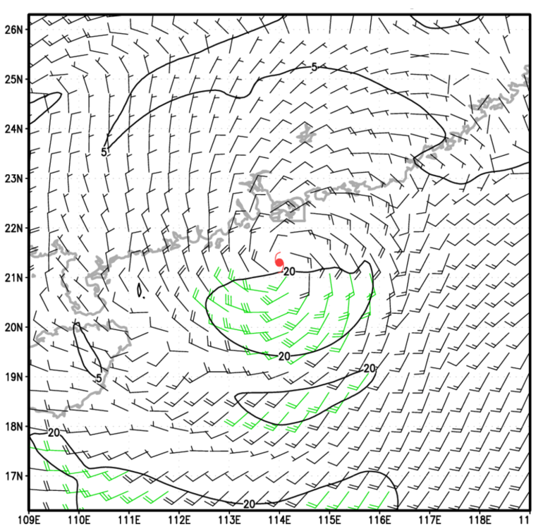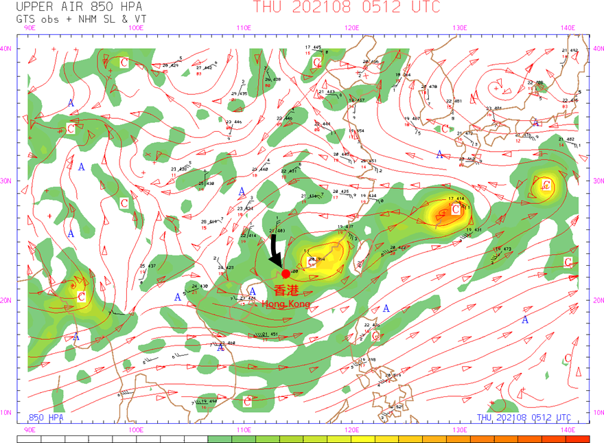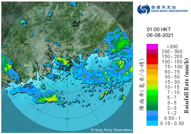 虽然卢碧在8月4日晚上开始远离香港,但卢碧相关的涡度[注1]随后一两日仍然复盖著本港,充沛的水汽和不稳定的大气亦为对流活动提供了良好的条件。随著卢碧移至香港以东,高空风亦从偏东风转为西北风(图十)。由于日间广东内陆的天色仍较为晴朗,陆地受日照加热触发对流活动,对流发展区随风暴环流移向沿岸地区,并在晚间影响本港。这些对流一般被称为「黄昏雷暴」,然而出现时间并不局限于黄昏。本港8月5日和6日凌晨时分曾受来自内陆的骤雨影响,天文台更在6日上午1时30分一度发出红色暴雨警告(图十一),当日早上多处地区录得超过30毫米雨量,其中上水及新田一带的雨量更超过100毫米。