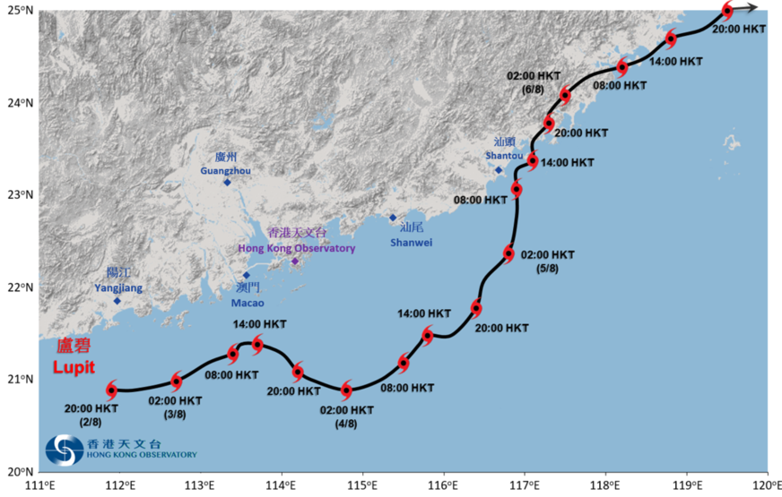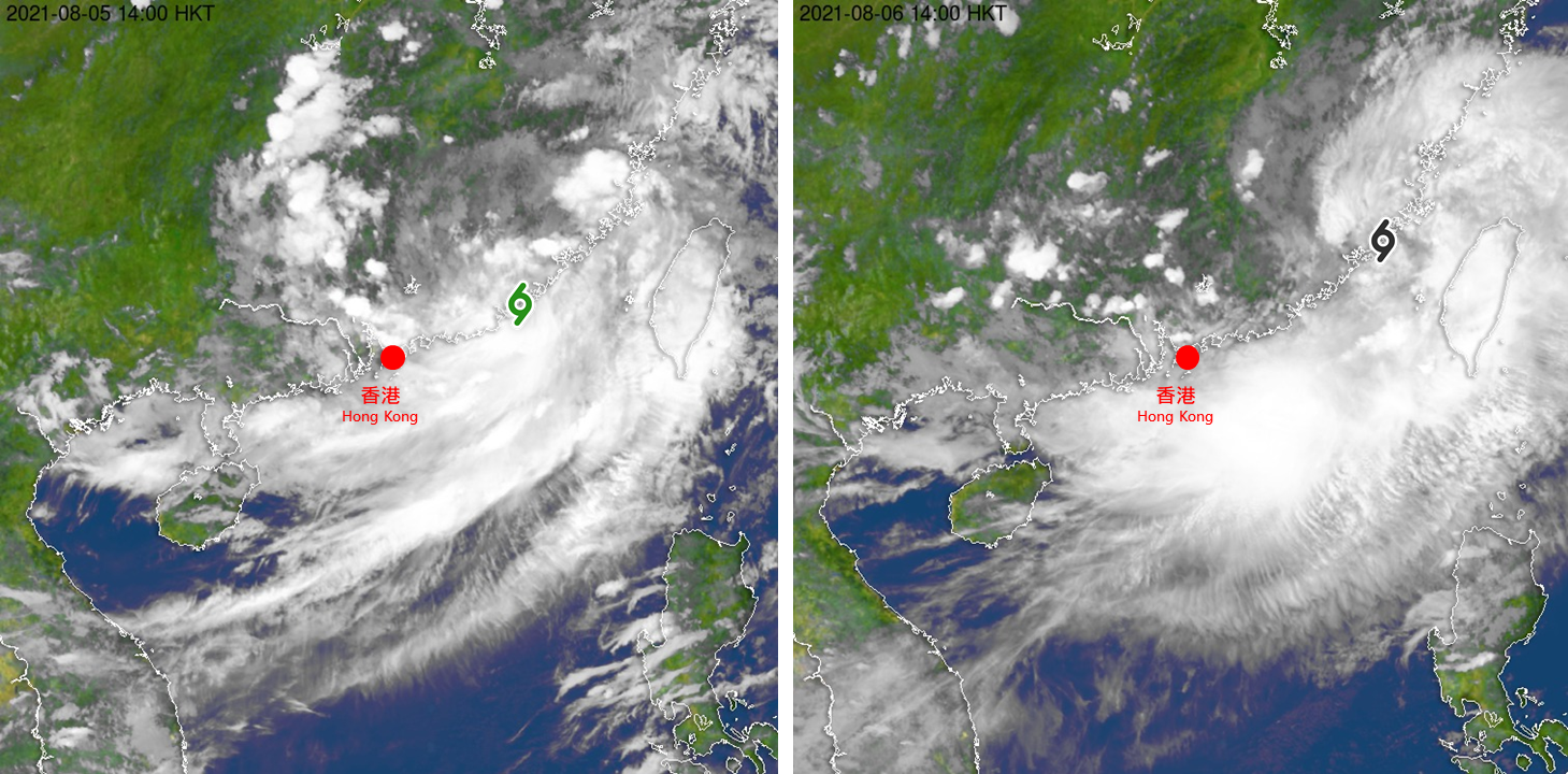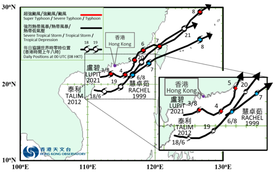 在2021年8月初于广东阳江近海形成的「卢碧」,却反其道而行,由西向东横过南海北部,在香港西南偏南约110公里掠过,更为本港带来三号强风信号,是少有从西面吹袭香港的热带气旋(图三)。