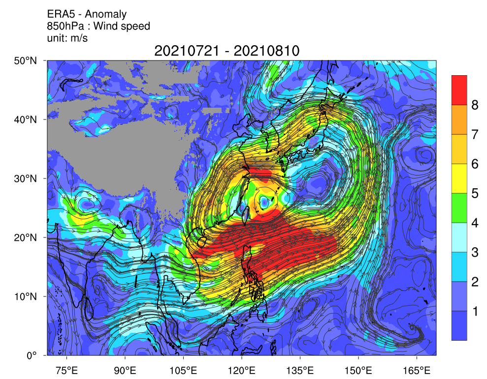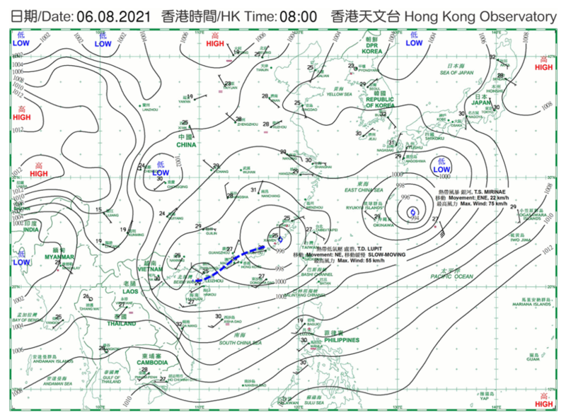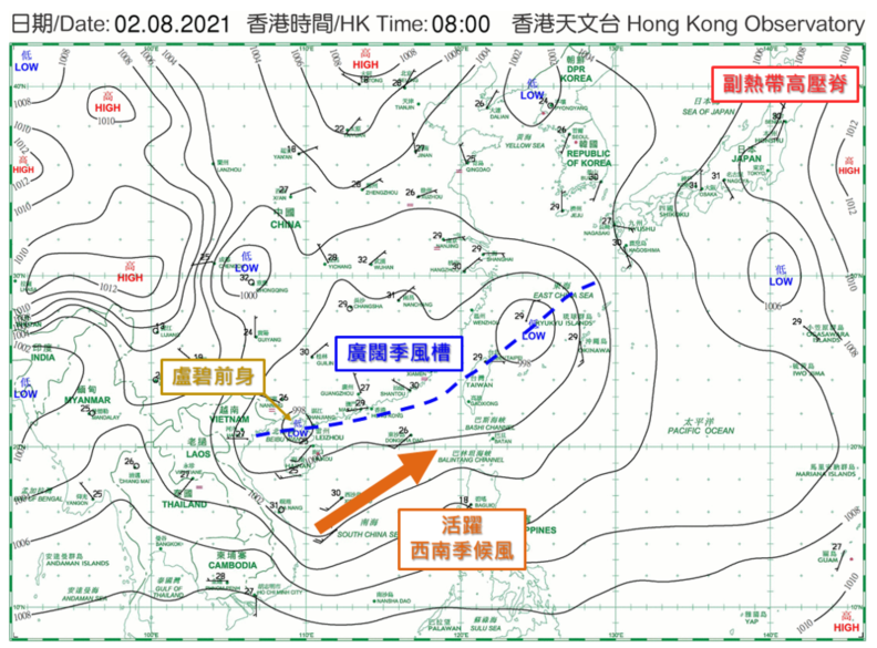 对比七至八月的气候平均(图二)和2021年七月下旬至八月上旬(图四)的500百帕斯卡风场,不难看出卢碧形成前后,副高的高压脊并非复盖华南,而是南移至南海南部,南海北部则受西南引导气流复盖。再看看卢碧形成当日(2021年8月2日)早上的地面天气图(图五),一道广阔季风槽的槽轴从北部湾一直延伸至琉球群岛一带,雷州半岛附近的低压区是卢碧的前身,而槽轴以南的等压线较紧密,显示西南季候风颇为活跃。由于缺乏副高引导,加上大气低层的西南风异常强(图六),卢碧于是在西南气流引导下,在南海北部大致向东至东北方向移动,及后掠过福建沿岸地区。