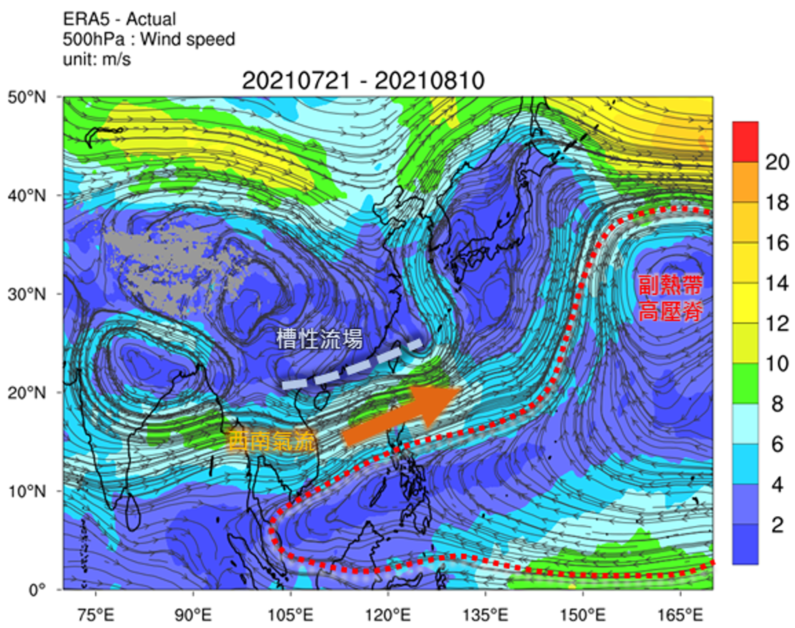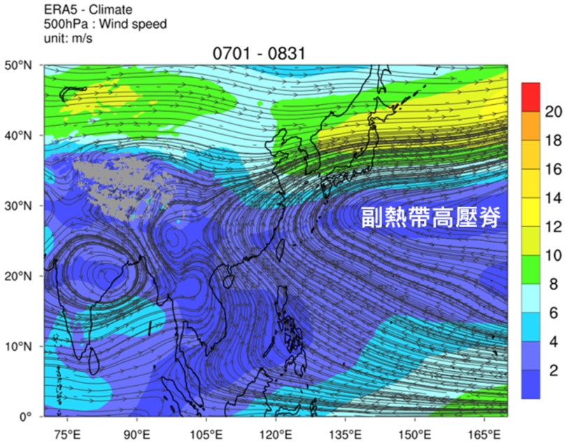 从气候平均的500百帕斯卡风场图 (高度约5000 - 6000米)(图二)可见,在盛夏季节,一个庞大的反气旋环流复盖著西北太平洋大部分地区和中国东南部,这就是副热带高压脊(下称「副高」)。副高是深厚的暖高压,这里的气流从高空下沉并变干,其支配的区域天气相对稳定,云量较少。副高也是引导热带气旋移动的主要天气系统之一,当副高较强时,高压脊会西伸至中国东南部甚至复盖整个华南,热带气旋受副高南侧的偏东风引导而采取西或西北路径,也就是上述的第一类路径。