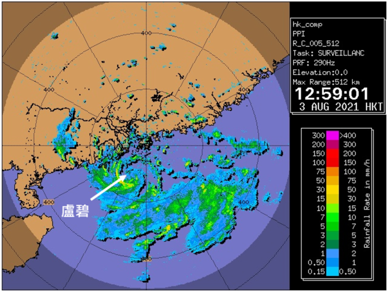 卢碧于2021年8月2日晚上8时左右在阳江近海从低压区增强为热带低气压,晚间大致向东北偏东移动,逐渐靠近香港。到了8月3 日早上,卢碧采取了比模式预期偏北的路径,亦稍为增强,对本港的威胁有所增加。从当日下午1时左右的雷达图像(图八)可见,卢碧的环流相当细小,由于西南季风带来水汽,卢碧南面的对流活动较为旺盛。在风力结构方面(图九),卢碧呈「南强北弱」之态,大风区相当不对称并主要集中在南侧,主要原因是叠加了西南季风和半圆效应。对于如此接近的热带气旋,预报员有必要认真考虑以下可能发生的情况:(一)卢碧有机会在较高海水温度和低垂直风切变的环境下进一步增强;(二)卢碧在2021年8月3日晚间有机会因数十公里的摆动而更接近香港,而大多数预报模式难以捕捉这种尺度的摆动。由于卢碧相当接近香港,只要上述其中一个情况发生,便可导致本地风势显著增强,有见及此,天文台在8月3日下午稍后发出三号强风信号。