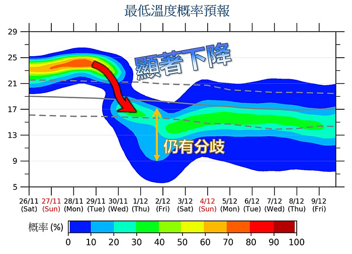 一道冷鋒會在星期二(11月29日)稍後至星期三(11月30日)早上橫過華南,最新的電腦模式預測圖顯示(圖一),隨後的強烈東北季候風會「掃走」原有的暖濕氣團,該區氣溫將顯著下降。根據最新的「最低溫度概率預報」(圖二),本港氣溫會在星期三顯著下降,星期四及星期五天氣相當清涼。但最低溫度能下探多少要視乎冷空氣向南擴展的路徑,集合預報系統對此仍有分歧。
