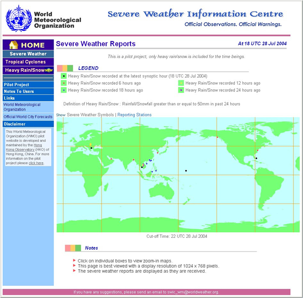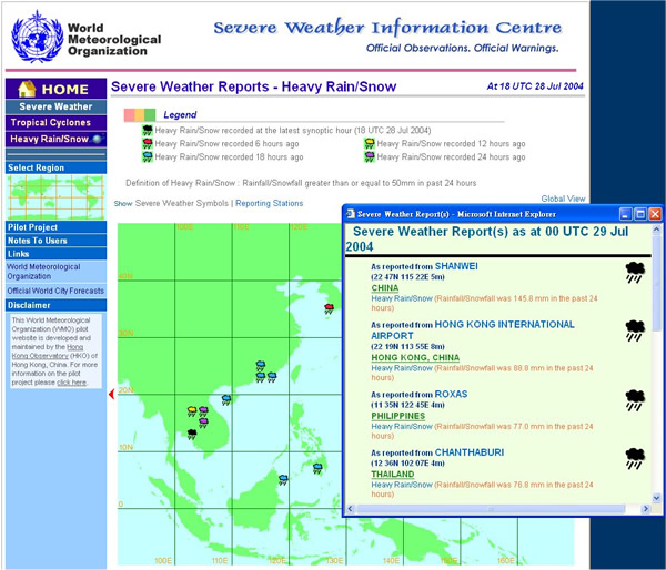 「世界氣象組織惡劣天氣信息中心」提供全球各地大雨信息 (2004年7月29日)